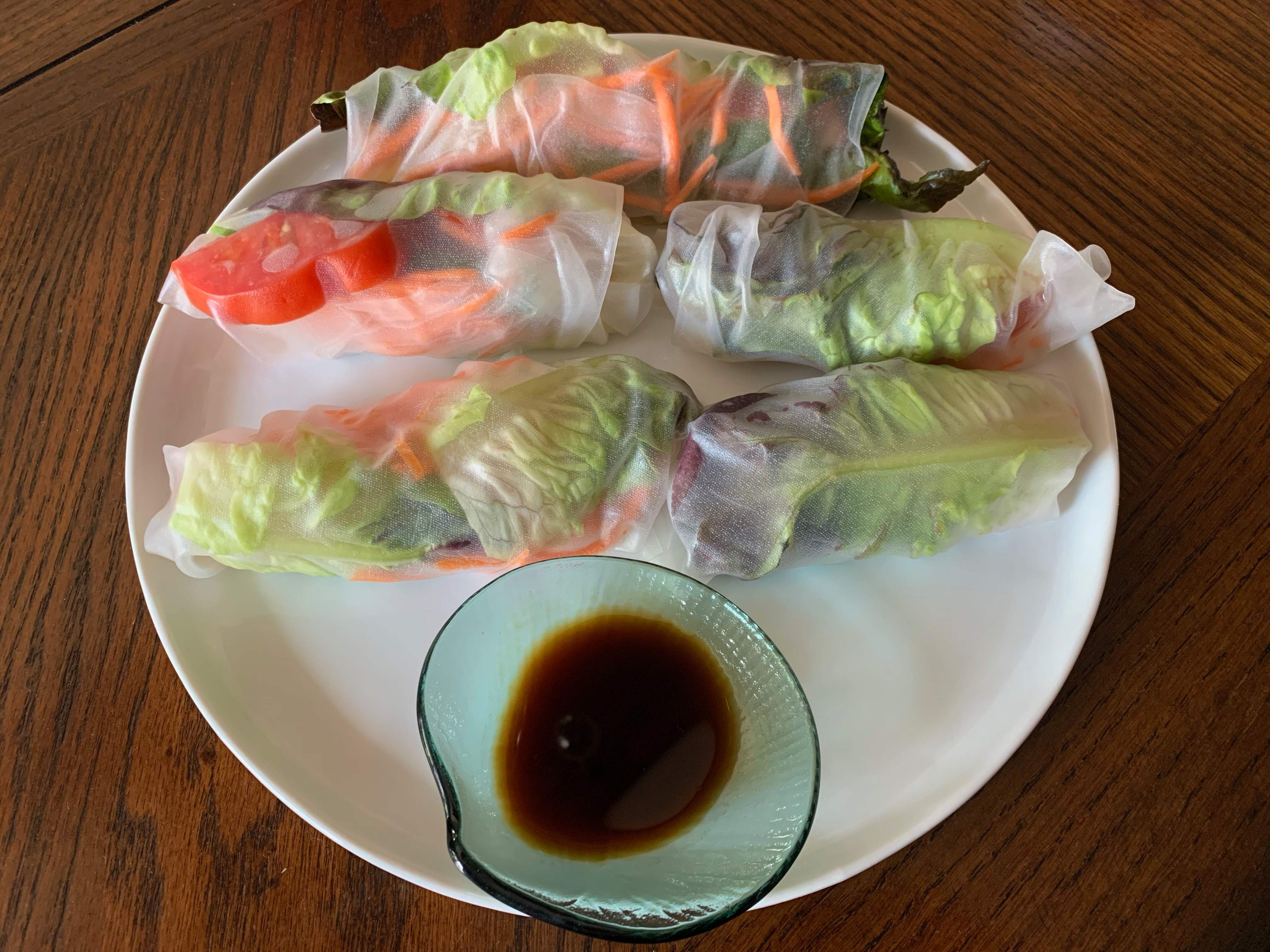 Lunch was veggie spring rolls with liquid aminos dipping sauce. Also organic grapes & a hot belly comfort tea after.