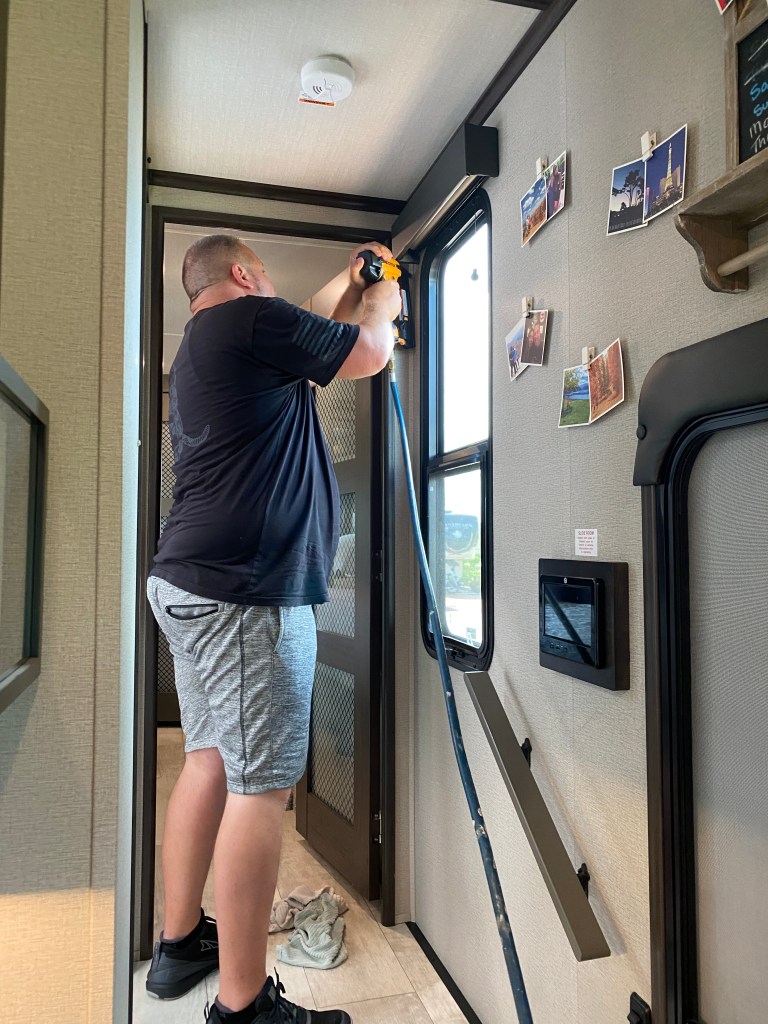 It’s been a mix of having fun, not so fun days and relaxing by the pool. Yesterday we finally got around to some much needed repairs & deep cleaning of the 5th wheel. Some of the trim fell down so Mike picked up a finishing nail gun and put it back up. Also reinforced loose ones while he was at it. I got a chance to dust form the top down, pull out the vacuum attachments and got the corners, etc and just got everything clean and in order. Living tiny has it’s perks. We had this whole place clean and put back together in a few hours.